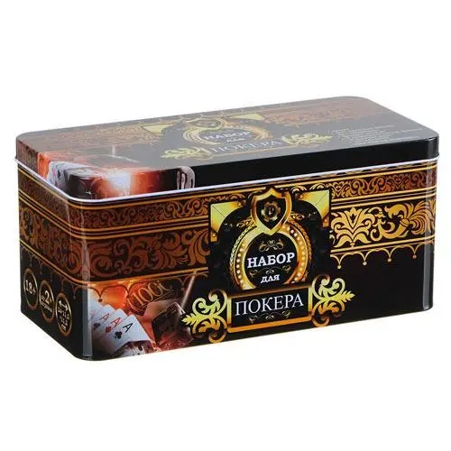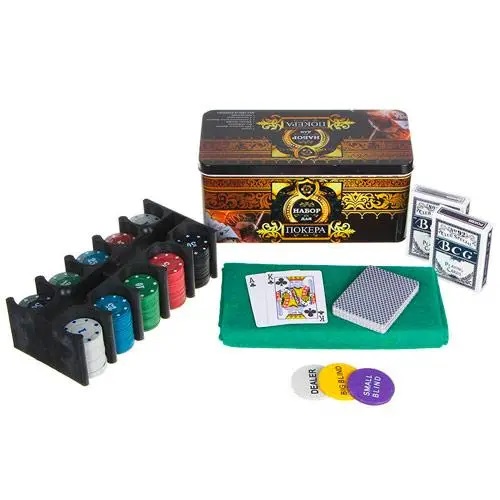 Набор для покера: карты, 200 фишек, сукно в металл коробке, покерный