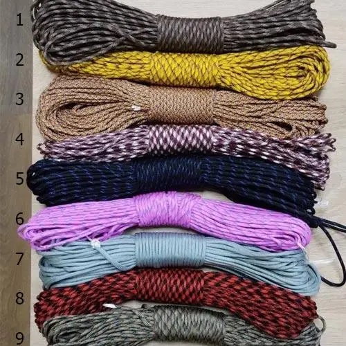 Цвет оболочки паракорда: коричневого хаки (1), желтого (2), желто-сине-красного (3), белого с красным (4), черного с синим (5), розового (6), светло серого (7), красного с черным (8), хаки (9). Если цвет важен, уточняйте актуальный цвет у менеджера, что есть на складе.