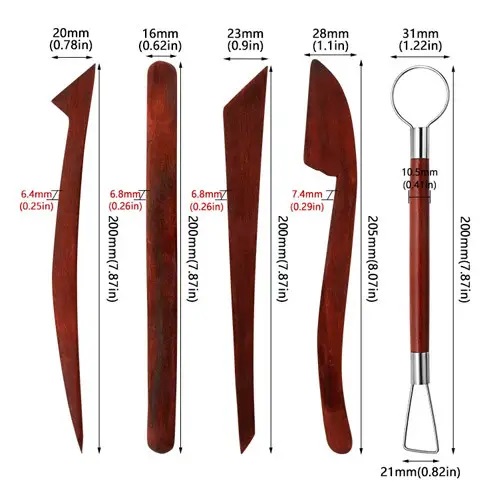 Набір двосторонніх дерев'яних інструментів (стеків) для виконання робіт з полімерною глиною в процесі творчості. Підійде для різьблення, моделювання, формування та вирівнювання майбутніх керамічних виробів.